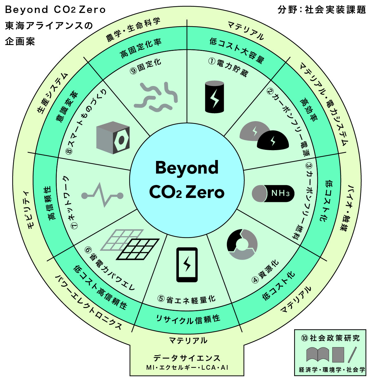 カーボンフリー電源(再⽣可能エネルギー、他)、カーボンフリー燃料(⽔素製造、他)、資源化(CO2のメタン化、他)、省エネ・軽量化、省電力パワーエレクトロニクスデバイス、ネットワーク社会、農学・生命科学(光合成促進、他)等を連携して研究開発します。さらに、各技術領域においてデータサイエンス(MI、エクセルギー、LCA、AIなど)を活⽤します。